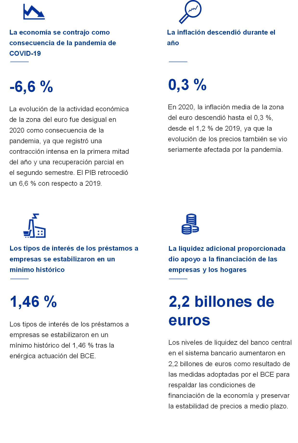 En 2020, la economía de la zona del euro se vio golpeada por la extraordinaria y grave perturbación originada por la pandemia de coronavirus (COVID-19). La actividad económica se contrajo notablemente durante el primer semestre del año como consecuencia de las medidas de confinamiento y del aumento de la aversión al riesgo. La respuesta firme y coordinada de las políticas monetaria y fiscal, junto con las noticias positivas sobre las vacunas, ayudaron a estabilizar la actividad en el segundo semestre. En conjunto, el PIB de la zona del euro se contrajo un 6,6 % en 2020. La inflación general anual se redujo hasta el 0,3 %, desde el 1,2 % de 2019, en gran parte como resultado del descenso de los precios de la energía, aunque también de otros factores relacionados con la pandemia. Por ejemplo, los sectores más duramente afectados por la crisis, como el transporte y la hostelería, contribuyeron a la caída de la inflación durante el segundo semestre del año.