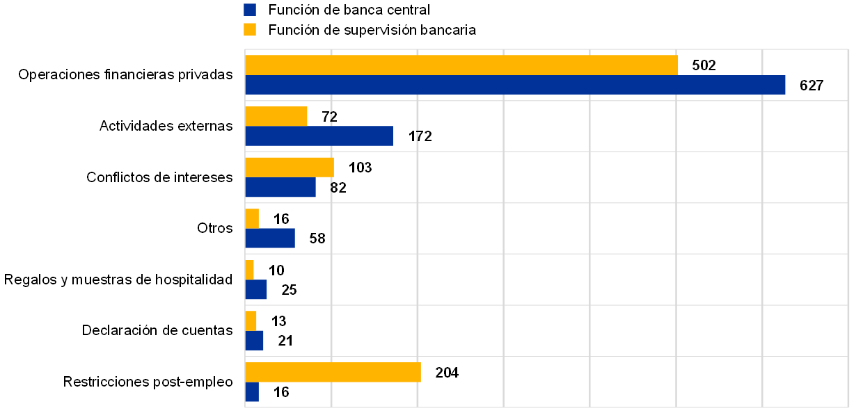 El BCE desarrolló nuevas iniciativas y campañas de comunicación para mantener informada a la plantilla sobre normas y disposiciones deontológicas, y todos los nuevos empleados siguieron el programa de formación online obligatorio «Being ethical». La Oficina de Cumplimiento y Gobernanza respondió a más de 1.900 consultas sobre una gran variedad de temas en 2020, formuladas a partes iguales por empleados tanto de la función de banca central como de la de supervisión bancaria. Casi el 60 % de estas consultas se refirieron a operaciones financieras privadas de empleados, seguidas de cuestiones relativas a actividades externas y a conflictos de intereses (véase gráfico 25). Las verificaciones efectuadas con el apoyo de un proveedor de servicios externo confirmaron el cumplimiento generalizado de las normas sobre operaciones financieras privadas por parte de los empleados y de los miembros de los órganos de alto nivel del BCE.