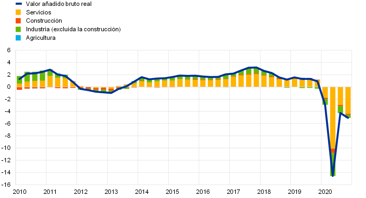 El impacto del COVID-19 en el crecimiento del producto también fue desigual en los distintos sectores, y los servicios fueron los que más contribuyeron a la caída del valor añadido bruto real, reflejo de su especial exposición a las medidas de distanciamiento social, así como a la composición sectorial de la economía de la zona del euro (véase gráfico 5).