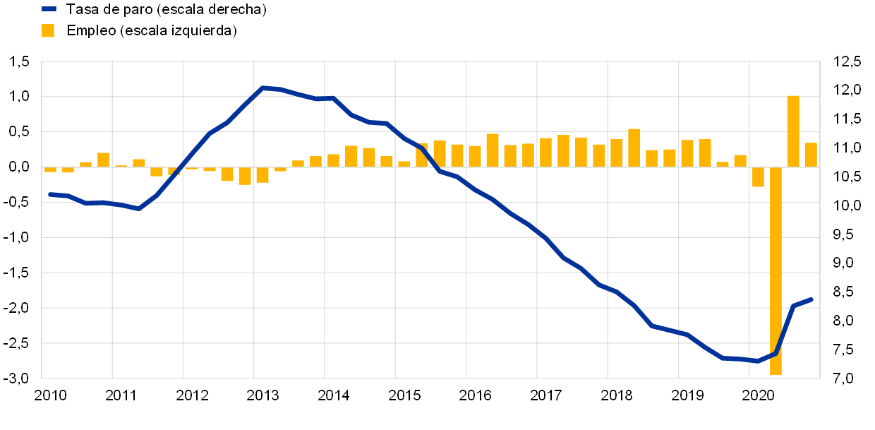 El empleo se contrajo un 1,9 % en 2020, mientras que la tasa de paro creció hasta el 8,4 %. La tasa de paro aumentó menos que en recesiones anteriores, como las de 2008-2009 y 2011-2012, también gracias a la oportuna y amplia respuesta de los Gobiernos de la zona del euro. Al mismo tiempo, el crecimiento de la productividad por hora trabajada fue de alrededor del 1 %, en promedio, en 2020 y se vio frenado por la sustancial reducción de las horas trabajadas debido al recurso a los programas de mantenimiento del empleo.