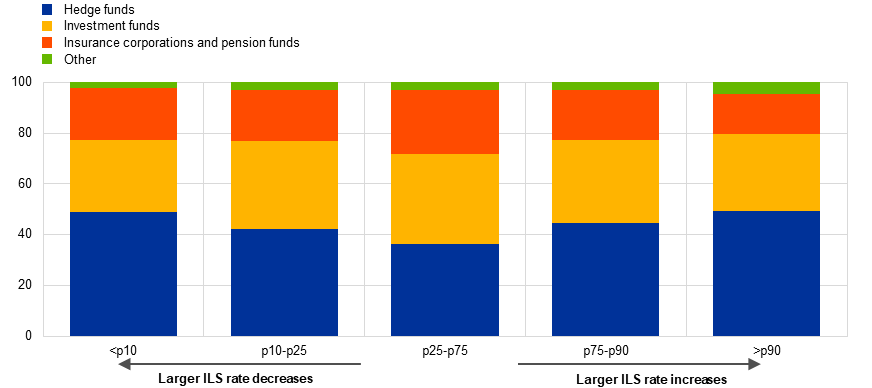 First, on days for which the strength of euro area ILS rate changes points to particularly relevant shocks (i.e. below the 10th and above the 90th percentiles), the notional traded by identified non-bank counterparties stems mainly from the hedge fund sector (Chart A).[19] This contrasts markedly with days of less pronounced ILS rate changes and hence presumably less relevant shocks. It is also worth noting that, in a mirror image of the shares accounted for by the hedge fund sector across buckets, those of insurance corporations and pension funds are inversely related to shock relevance.