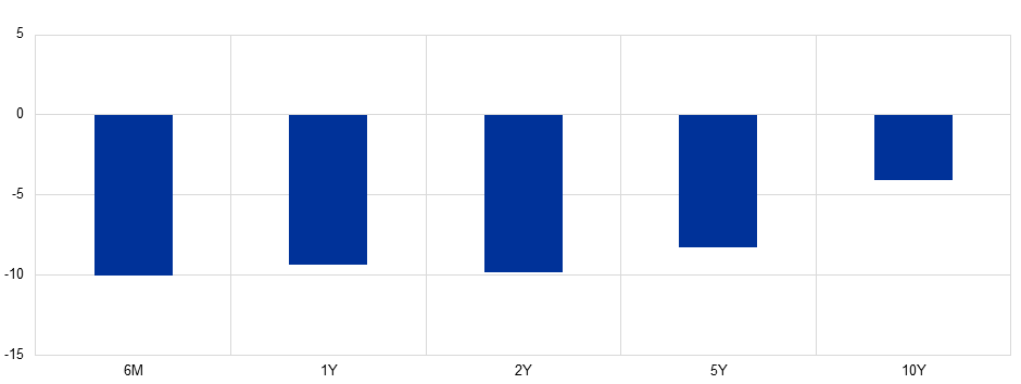 Owing to changes in macroeconomic conditions and the need to adapt the monetary policy response, several recalibrations were made to the APP.[28] Accordingly, as is shown in Chart 9, the contemporaneous term premium impact changed over time, reaching its maximum of more than 100 basis points in mid-2016, when markets were expecting a significant expansion of the APP in light of increased uncertainty induced by the Brexit referendum outcome. When the end of net purchases was announced in June 2018, the impact on ten-year sovereign bond yields was estimated to be around 90 basis points. The additional duration extraction associated with the renewed net purchases that started this month has contributed to a further compression of the term premium. Currently, staff estimate the euro area sovereign ten-year rate to be more than 100 basis points lower than in a counterfactual where the APP never happened, and the curve to be distinctly flatter (see again Chart 8).