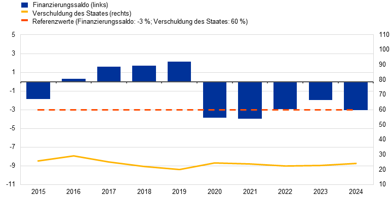 Was das Kriterium der öffentlichen Finanzen betrifft, war Bulgarien seit 2012 nicht Gegenstand eines Verfahrens bei einem übermäßigen Defizit. Sein gesamtstaatliches Haushaltsdefizit lag 2024 bei 3,0 % des BIP und entsprach somit dem Referenzwert von 3 % (siehe Abbildung 2). Seine öffentliche Schuldenquote betrug 24,1 % und lag somit deutlich unter dem Referenzwert von 60 %. Dies war auch in den letzten 20 Jahren der Fall.