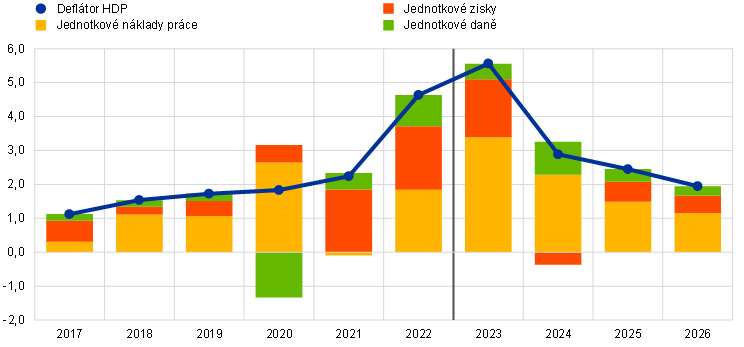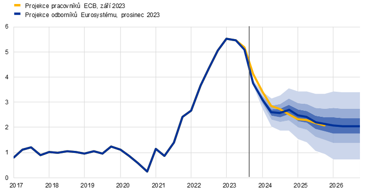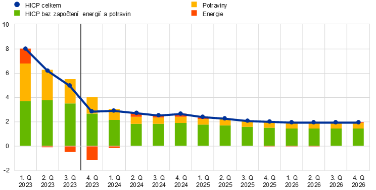 Inflace se nadále snižovala v důsledku klesajícího tempa růstu cen energií, dopadu zpřísnění měnové politiky a pokračujícího zmírňování tlaků v dodavatelských řetězcích a překážek v dodávkách. Po poklesu na 2,4 % v listopadu 2023 se očekává, že inflace měřená HICP v krátkodobém horizontu dočasně oživí v důsledku zotavení růstu cen energií. Základní dezinflační proces by však měl pokračovat i přes výrazný růst nákladů práce, které jsou stále více dominantním faktorem inflace měřené HICP bez započtení energií a potravin. I přes určité ochlazení se předpokládá, že trh práce zůstane napjatý, což by spolu s kompenzačními vlivy dřívější vysoké inflace mělo udržet růst nominálních mezd na vysoké úrovni. Růst mezd by se však měl v horizontu projekcí zmírňovat s tím, jak budou postupně odeznívat růstové dopady inflační kompenzace. Zisky v roce 2022 výrazně vzrostly, ale v horizontu projekcí by měly oslabit a poskytnout rezervu pro promítání nákladů práce. Vzhledem k hodnocení, že střednědobá inflační očekávání zůstanou ukotvena na úrovni 2% inflačního cíle ECB, by se celková inflace měřená HICP měla snížit z průměrné hodnoty 5,4 % v roce 2023 na 2,7 % v roce 2024, 2,1 % v roce 2025 a 1,9 % v roce 2026. V porovnání s projekcemi ze září 2023 byla inflace měřená HICP pro roky 2023 a 2024 revidována směrem dolů, a to především v důsledku nižších než očekávaných nedávno zveřejněných údajů a nižších předpokladů pro ceny energetických komodit, zatímco pro rok 2025 zůstává beze změny.