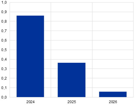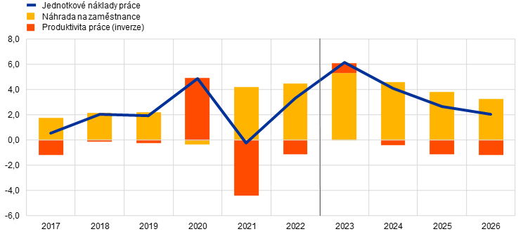 I když se očekává, že růst nominálních mezd zůstane silný a bude podporován stále napjatou situací na trzích práce, měl by časem postupně klesat s tím, jak budou odeznívat tlaky spojené s inflačními kompenzacemi a růstem minimálních mezd. Tempo růstu náhrady na zaměstnance by mělo v roce 2026 klesnout na 3,3 % oproti 5,3 % v roce 2023. V porovnání se zářijovými projekcemi bylo tempo růstu pro rok 2024 revidováno směrem nahoru, pro rok 2025 však zůstalo beze změny. Revize pro rok 2024 směrem nahoru odráží napjatější situaci na trhu práce a očekávaný silnější růst sjednaných mezd v blízké budoucnosti. Silnější růst mezd také implikuje, že ztráty kupní síly vzniklé od prudkého nárůstu inflace by se měly do konce roku 2024 zotavit, což je o něco dříve, než se očekávalo v zářijových projekcích. Očekává se, že růst jednotkových nákladů práce dosáhl vrcholu a podle projekcí bude výrazně klesat, a to částečně díky předpokládanému zrychlení růstu produktivity (graf 8), který by však měl zůstat pod úrovní, kterou naznačuje historický trend.