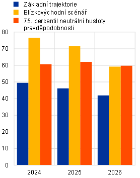 Poznámky: V této citlivostní analýze odkazují 10. a 90. percentil na neutrální hustoty pravděpodobnosti odvozené z opcí pro ceny pšenice a kukuřice ke dni 23. listopadu 2023. Vývoj hustot pravděpodobnosti odvozených z opcí je transformován na vliv výstupních cen zemědělské produkce eurozóny. Makroekonomické dopady jsou vypočítány pomocí elasticit z makroekonomických modelů Eurosystému používaných v projekcích.