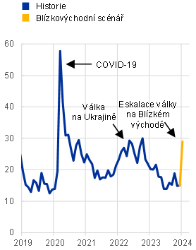 Hospodářský výhled je nadále spojen s vysokou mírou nejistoty, což se odráží v pásmu nejistoty kolem projekcí hospodářského růstu a inflace (grafy 1, 4 a 7). Tato zpráva obsahuje scénář vyhodnocující důsledky potenciální eskalace konfliktu na Blízkém východě pro ekonomiku eurozóny (box 3) a řadu citlivostních analýz souvisejících s alternativním vývojem cen energetických a potravinářských komodit (box 4).