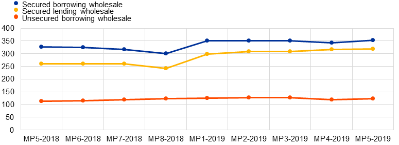 - The Eurosystem collects transaction-by-transaction information from the 50 largest euro area banks in terms of banks’ total main balance sheet assets, broken down by their borrowing from and lending to other counterparties. Unsecured transactions include all trades concluded via deposits, call accounts or short-term securities with financial corporations (except central banks where the transaction is not for investment purposes), general government as well as with non-financial corporations classified as “wholesale” under the Basel III LCR framework. Secured transactions cover all fixed-term and open-basis repurchase agreements and transactions entered into under those agreements, including tri-party repo transactions, denominated in euro with a maturity of up to one year, between the reporting agent and financial corporations (except central banks where the transaction is not for investment purposes), general government as well as non-financial corporations classified as wholesale under the Basel III liquidity coverage ratio framework. As of the first maintenance period of 2019, the wholesale sector covers all counterparties in the sectors listed above. More information on the methodology applied, including the list of reporting agents, is available in the statistics section of the ECB’s website.