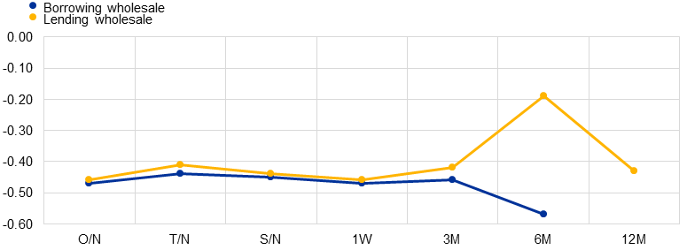 In the fifth maintenance period, the borrowing turnover in the secured segment averaged €352 billion per day, while the total borrowing turnover for the period as a whole was €12,330 billion. Cash lending represented a turnover of €11,124 billion and the daily average amounted to €318 billion. Most of the turnover was concentrated in tenors ranging from overnight to up to one week, with overnight transactions representing around 20% of the total nominal amount on the borrowing and lending side respectively. The weighted average overnight rate for borrowing and lending transactions was, respectively, -0.47% and -0.46% for the wholesale sector, compared with -0.47% for both borrowing and lending in the previous maintenance period.