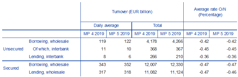 In the fifth maintenance period, which started on 31 July 2019 and ended on 17 September 2019, the borrowing turnover in the unsecured segment averaged €122 billion per day. The total borrowing turnover for the period as a whole was €4,266 billion. Borrowing from credit institutions, i.e. on the interbank market, represented a turnover of €367 billion, i.e. 9% of the total borrowing turnover, and lending to other credit institutions amounted to €210 billion. Overnight borrowing transactions represented 51% of the total borrowing nominal amount. The weighted average overnight rate for borrowing transactions was -0.45% for the interbank sector and -0.42% for the wholesale sector, the same as in the previous maintenance period.