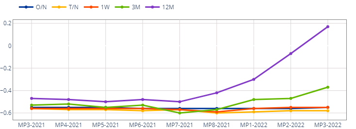In the third maintenance period of 2022, which started on 20 April 2022 and ended on 14 June 2022, the borrowing turnover in the unsecured segment averaged €129 billion per day. The total borrowing turnover for the period as a whole was €5,143 billion. Borrowing from credit institutions, i.e. on the interbank market, represented a turnover of €430 billion, i.e. 8% of the total borrowing turnover. Lending to credit institutions amounted to €310 billion. Overnight borrowing transactions represented 68% of the total borrowing nominal amount. The weighted average overnight rate for borrowing transactions was -0.59% for the interbank sector and -0.55% for the wholesale sector, compared with -0.58% and -0.56% respectively in the previous maintenance period.