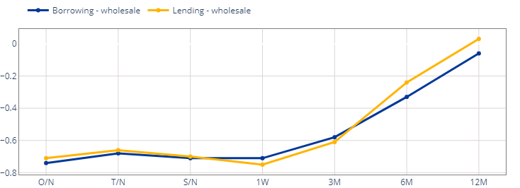 - Daily average borrowing turnover in the secured segment increased from €404 billion to €413 billion, with a weighted average overnight rate of -0.74%