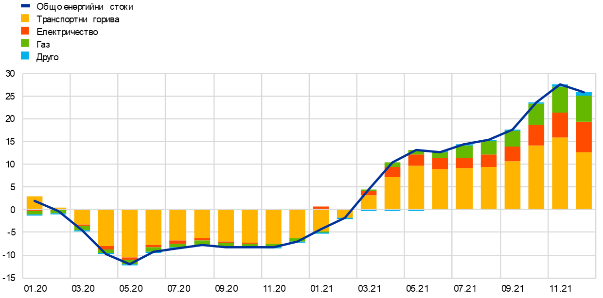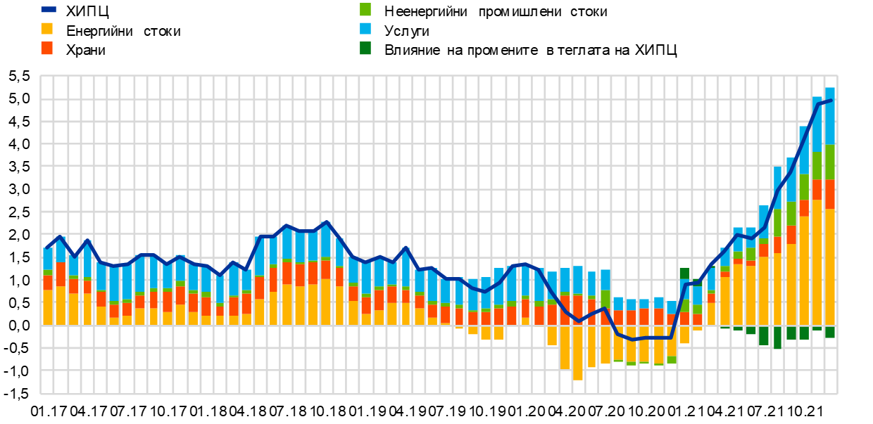 През 2021 г. световната икономика отбеляза значително възстановяване, най-вече поради отварянето на икономиките на фона на по-бързите темпове на ваксинация срещу COVID-19 и силните и навременни мерки за подкрепа. В развитите икономики и в икономиките с нововъзникващи пазари обаче възстановяването беше донякъде неравномерно. Инфлацията се повиши в световен мащаб, отразявайки главно рязкото поскъпване на енергийните стоки и търсене, изпреварващо предлагането в някои сектори предвид неблагоприятните фактори, породени от пандемията, както и други затруднения, свързани с доставките и транспорта. В еврозоната реалният БВП отбеляза силен растеж през 2021 г. след най-големия спад, регистриран през предишната година. Възстановяването, довело до подобряване на пазарите на труда, бе подпомогнато от своевременни и решителни мерки по паричната и фискалната политика. Въпреки това икономическата несигурност през годината остана повишена, а разликата между двата най-големи сектора – промишлеността и услугите, беше ясно изразена. В началото на годината растежът беше засегнат от карантинните мерки и ограниченията за пътуване, които се отразиха неблагоприятно върху предлагането и търсенето на услуги. По-късно, след извънредно силното възстановяване на търсенето в световен мащаб появата на трудности в предлагането и по-високите енергийни разходи ограничиха производството в промишлеността. Инфлацията в еврозоната, измерена чрез хармонизирания индекс на потребителските цени (ХИПЦ), рязко нарасна до 2,6% през 2021 г. спрямо 0,3% през 2020 г. През първите няколко месеца тя остана на ниски равнища, след което през годината се ускоряваше, като през декември достигна 5,0%. Скокът в цените се дължеше в голяма степен на рязкото и всеобхватно поскъпване на енергийните стоки, диспропорциите между търсенето и предлагането след отварянето на икономиките и на по-скоро технически фактори, като отмяната на временното намаление на ДДС в Германия. След края на 2021 г. инфлацията се очакваше да остане висока в краткосрочен хоризонт, а през 2022 г. да се забави. Нахлуването обаче на Русия в Украйна значително увеличи несигурността относно перспективите за инфлацията.