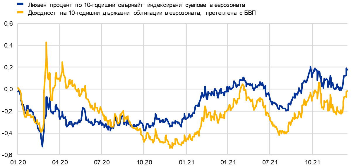 Забележка: Последните наблюдения са за 2021 г. (ляв панел) и за четвъртото тримесечие на 2021 г. (десен панел) и се базират на предварителни месечни данни.
