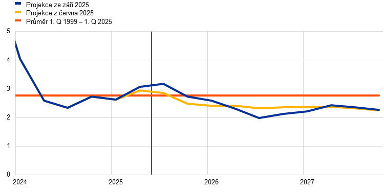 Výhled inflace odpovídá tomu, že se inflace stabilizuje poblíž 2% střednědobého cíle. Celková inflace, měřená harmonizovaným indexem spotřebitelských cen (HICP), by měla po zbytek roku 2025 kolísat poblíž 2 %, v roce 2026 klesnout na 1,7 % a následně se v roce 2027 zotavit na úroveň 1,9 %. Pokles v roce 2026 odráží další postupné snižování cen neenergetických složek, zatímco růst cen energií by měl zůstat volatilní, ale v horizontu projekcí by měl zesílit, částečně v důsledku spuštění systému EU pro obchodování s emisemi ETS2 v roce 2027. Očekává se, že ceny potravin zpočátku i nadále porostou rychleji, neboť se projeví zpožděné dopady dřívějšího růstu cen mezinárodních potravinářských komodit. V letech 2026 a 2027 by však růst měl zmírnit na úroveň mírně nad 2 %. Inflace měřená HICP bez započtení energií a potravin (HICPX) by měla klesat s tím, jak poleví mzdové tlaky a zmírní se růst cen služeb a jak se posilování eura projeví v cenovém řetězci a omezí růst cen zboží. Očekává se, že nižší růst mezd vyplývající z již realizované kompenzace ztrát reálných mezd v minulosti a oživení růstu produktivity povedou k výrazně pomalejšímu růstu jednotkových mzdových nákladů. V porovnání s projekcemi z června 2025 byl výhled celkové inflace měřené HICP revidován pro rok 2025 i 2026 o 0,1 procentního bodu směrem nahoru. Důvodem jsou vyšší aktuální údaje o cenách energetických komodit i předpoklady o jejich budoucím vývoji a také zpožděné účinky vyšších mezinárodních cen potravinářských komodit, které převažují nad posílením eura. Očekává se, že v roce 2027 budou převládat zpožděné účinky posilování eura, což povede k revizi o 0,1 procentního bodu směrem dolů.