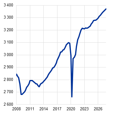 Výhled zahraniční poptávky pro eurozónu zůstává utlumený a v porovnání s červnovými projekcemi byl mírně revidován směrem dolů. Růst zahraniční poptávky v eurozóně by měl klesnout z 3,6 % v roce 2024 na 2,8 % v roce 2025, dále oslabit na 1,4 % v roce 2026 a poté se v roce 2027 zvýšit na 3,1 % (tabulka 2). Ve srovnání s projekcemi z června 2025 byla zahraniční poptávka v eurozóně pro rok 2026 upravena směrem dolů. Kumulativní revize zahraniční poptávky v eurozóně v letech 2025–2027 jsou však menší než revize světového obchodu, což odráží dopady geografických faktorů – konkrétně vyšší než očekávaný dovoz do Spojeného království ve druhém čtvrtletí a revize směrem nahoru pro země střední a východní Evropy, které jsou způsobeny německým fiskálním stimulem a výdaji týkajícími se obrany.